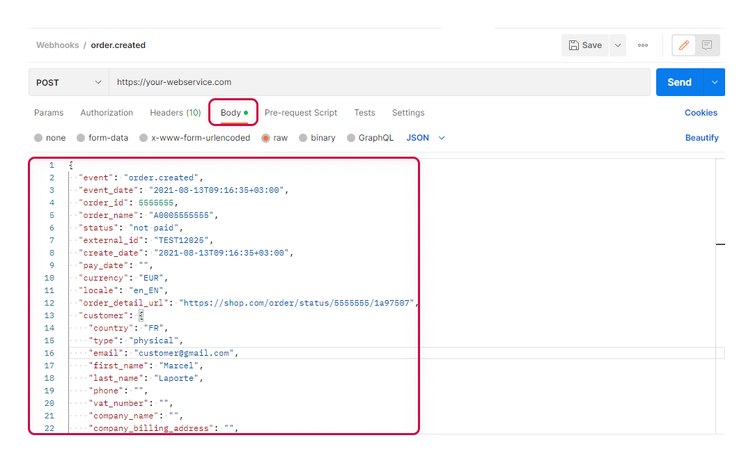 If you need to fine-tune your web service for receiveing webhooks, you can do so using our collection of Postman requests. Use the collection to send a webhook to the URL of your web service yourself, emulating our web service.