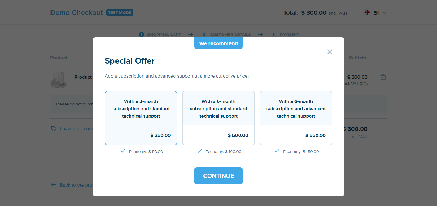 show the customer an up-sell offer of a product for replacement - Demo product with extended technical support