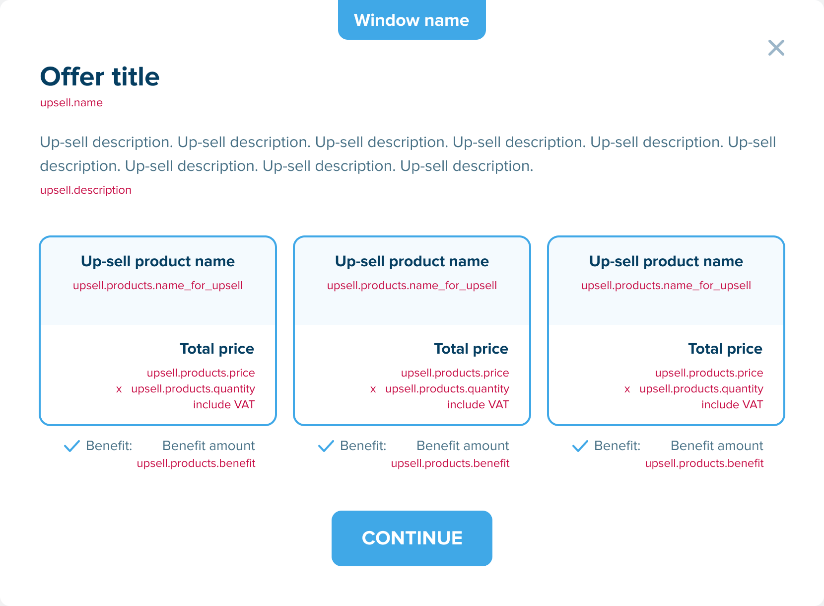 The up-sell offer contains the data of the products from object upsell. In addition, special names (upsell.products.name_for_upsell) are used for the products that will be visible only in the offer window.