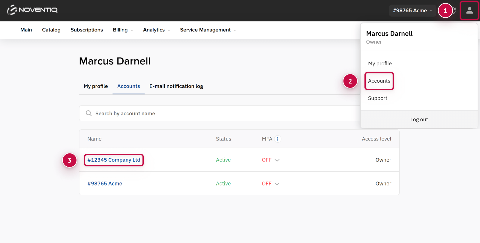 Select Accounts. A list of accounts associated with your user is displayed.