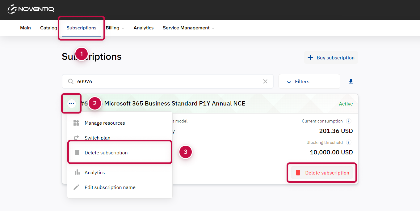 Deleting a subscription is available within a limited period after its purchase and renewal. When the period expires, deleting the subscription becomes unavailable.