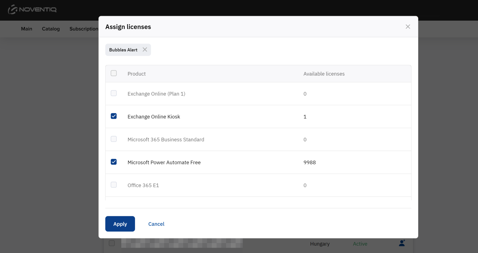 Select the checkboxes of the licenses you want to assign to all selected users and clear the checkboxes of the licenses you want to remove. The number of available licenses is updated on the go. A checkbox cannot be selected if your Microsoft tenant does not have enough available licenses to assign to all selected users.