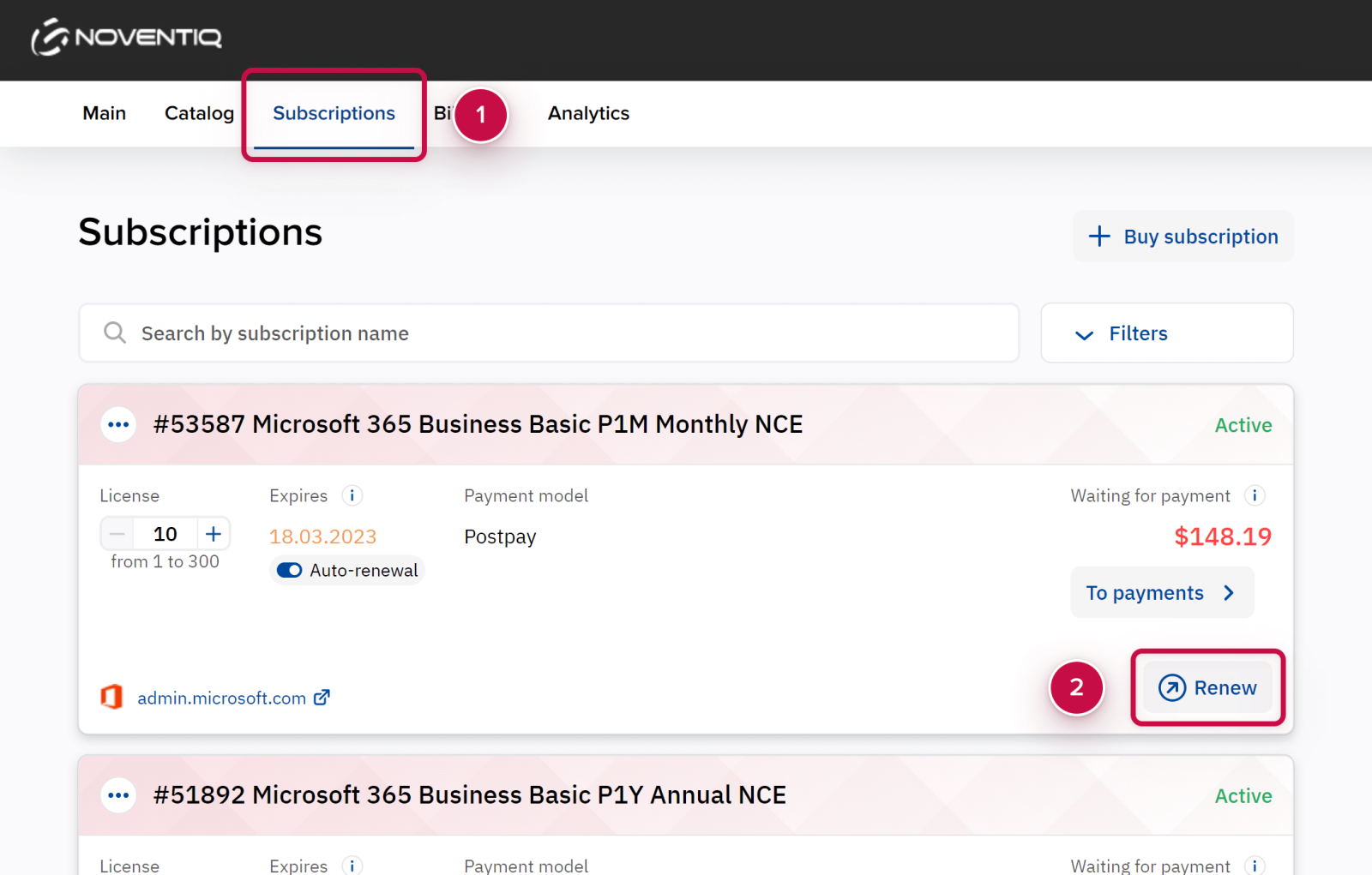 The platform will create a renewal order in the Waiting for provisioning status. On the expiration date, the order will be completed, and the subscription will be renewed. Until that moment, you can modify the order or select a different renewal option.