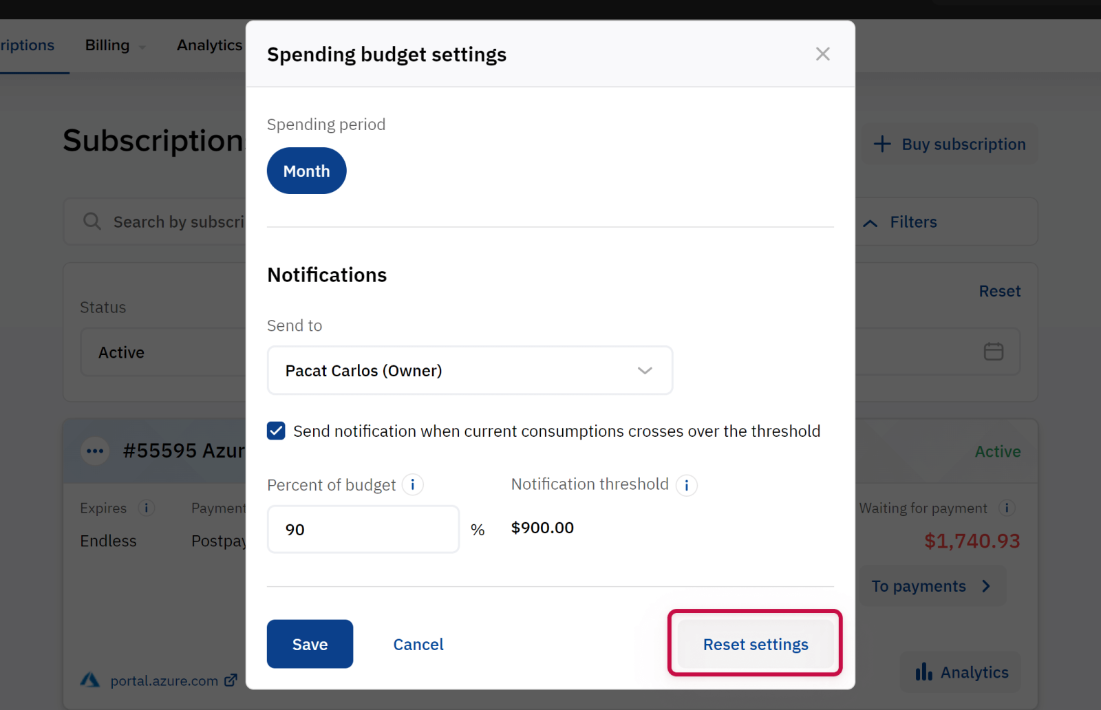 To clear a spending budget for a subscription and stop sending related notifications, in the Spending budget settings pop-up window, click Clear settings.