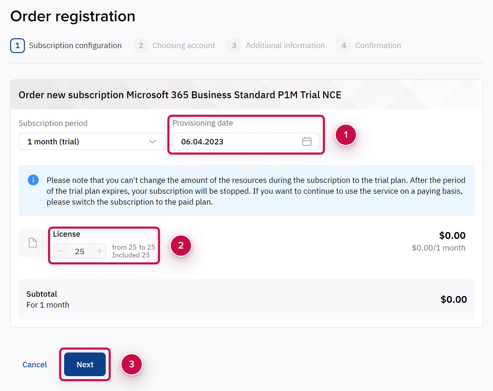 Please note that the quantity of resources is pre-defined for a trial subscription. You will be able to change the quantity of resources when purchasing a full-featured subscription further.