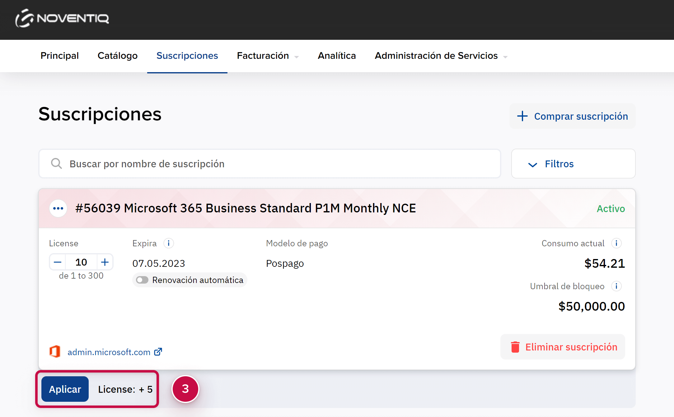 • La plataforma automáticamente calculará el costo del uso de la suscripción.