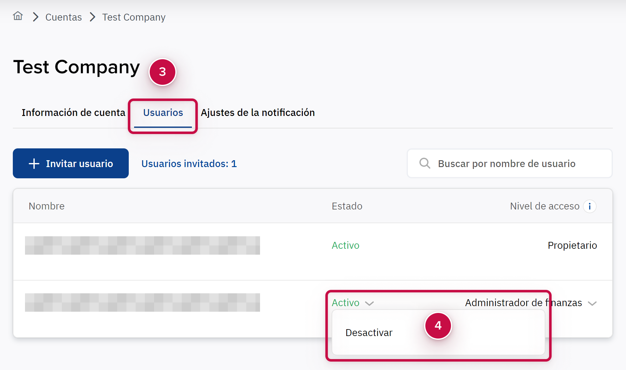Para el usuario requerido, en la columna Estado, seleccione Desactivar desde el menú ➃.