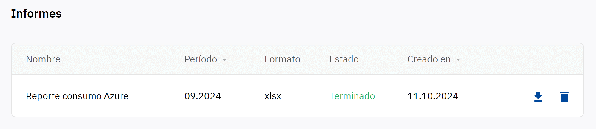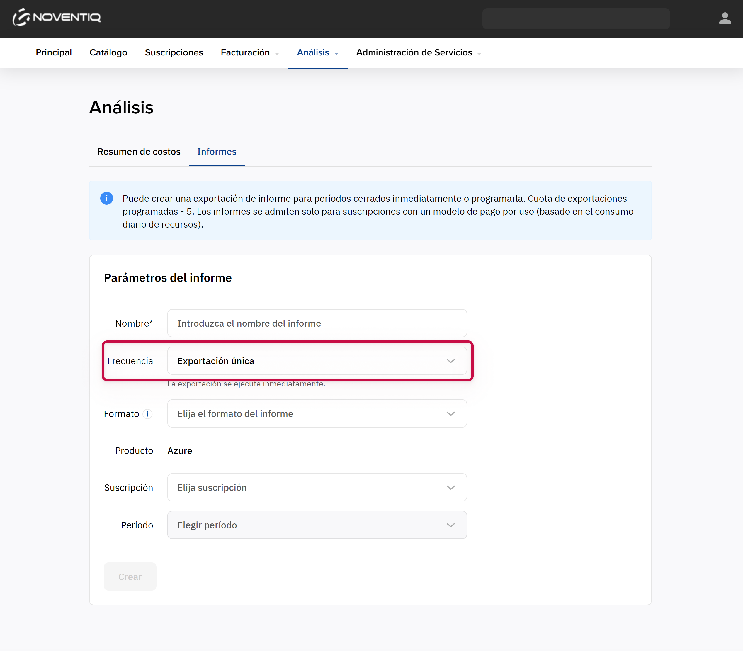 A diferencia de los informes programados, los informes únicos se pueden generar en cualquier momento y para cualquier mes del último año. Los datos de consumo del mes anterior estarán disponibles a partir del día 13.