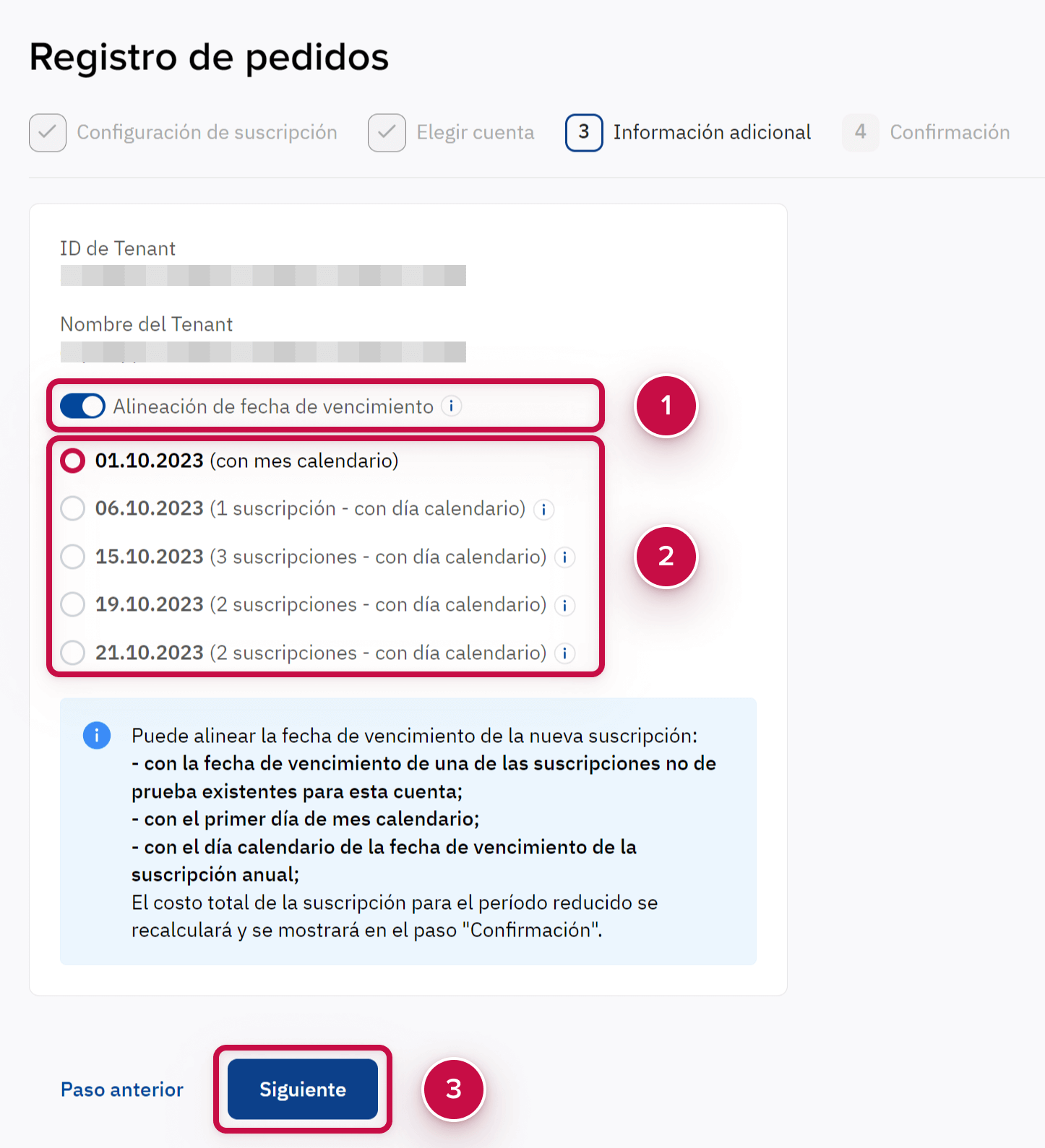 Para las suscripciones anuales, solo están disponibles las fechas de vencimiento de otras suscripciones anuales en el plazo de un año a partir de la fecha de presentación seleccionada.