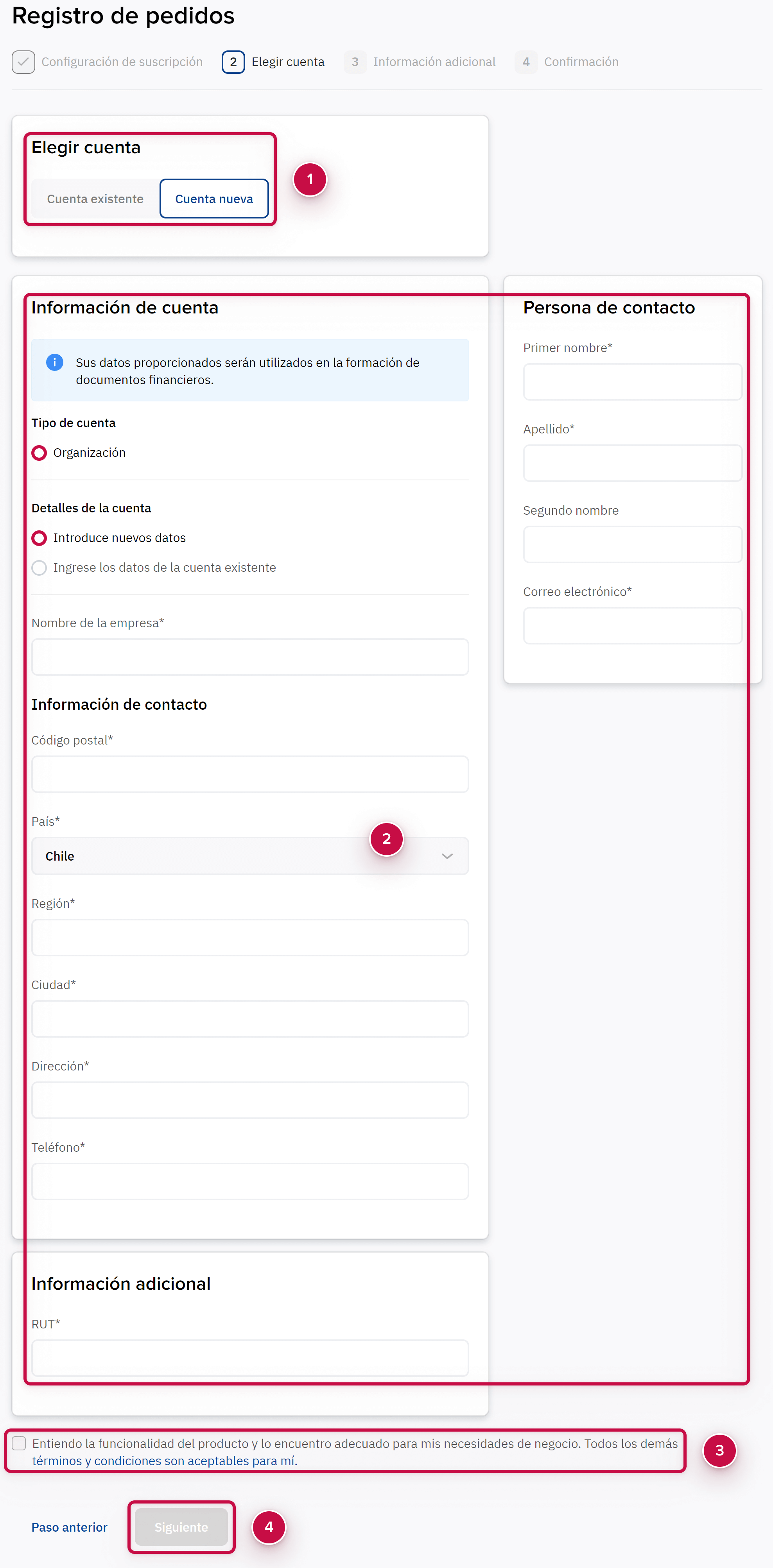 Al crear una cuenta nueva, complete los requisitos de la organización.