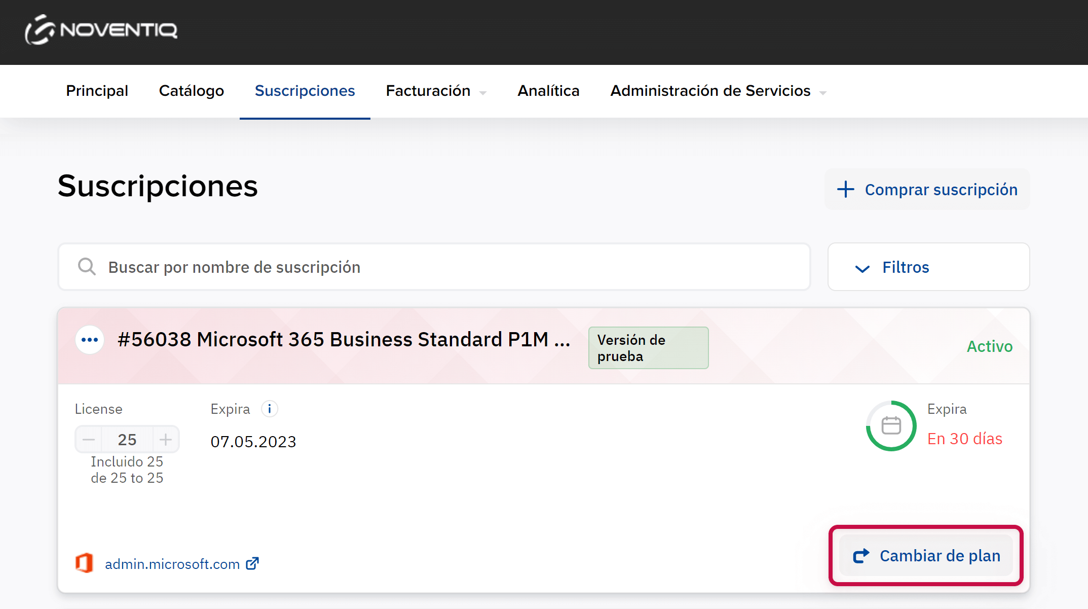 Antes del vencimiento de la suscripción recibirá una notificación con instrucciones sobre la elección del plan para continuar trabajando con el servicio. También puede cambiar a un plan de pago antes de que finalice su suscripción de prueba haciendo clic en Cambiar a un plan de pago o solicitar una suscripción nueva.