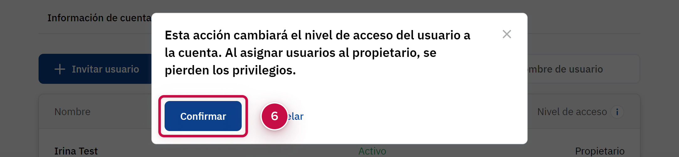 Sólo el Propietario de la cuenta actual puede cambiar el Propietario de la cuenta. Después del cambio, el Propietario anterior pierde el acceso a las capacidades de este rol y obtiene el rol de Administrador.