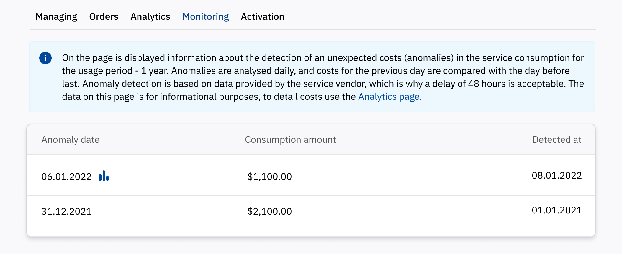 La plataforma incluye el servicio de detección de anomalías en el consumo del servicio con el modelo de pago por uso. Este servicio es relevante para servicios como Infraestructura como Servicio como Microsoft Azure, Google Cloud Platform, AWS. El servicio está disponible de forma predeterminada para todos los clientes con suscripciones activas al servicio.
