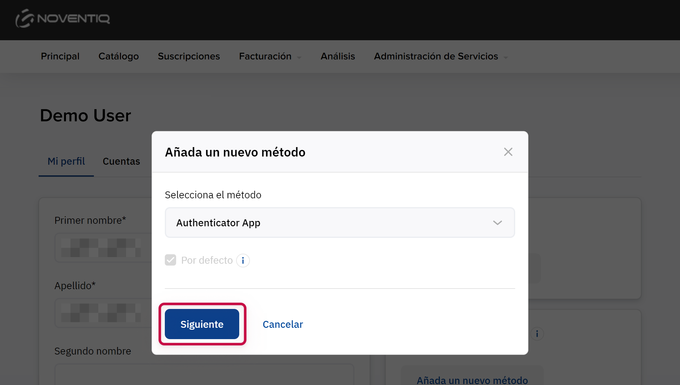Haga click en Siguiente. Se mostrará la página de configuración del método MFA.