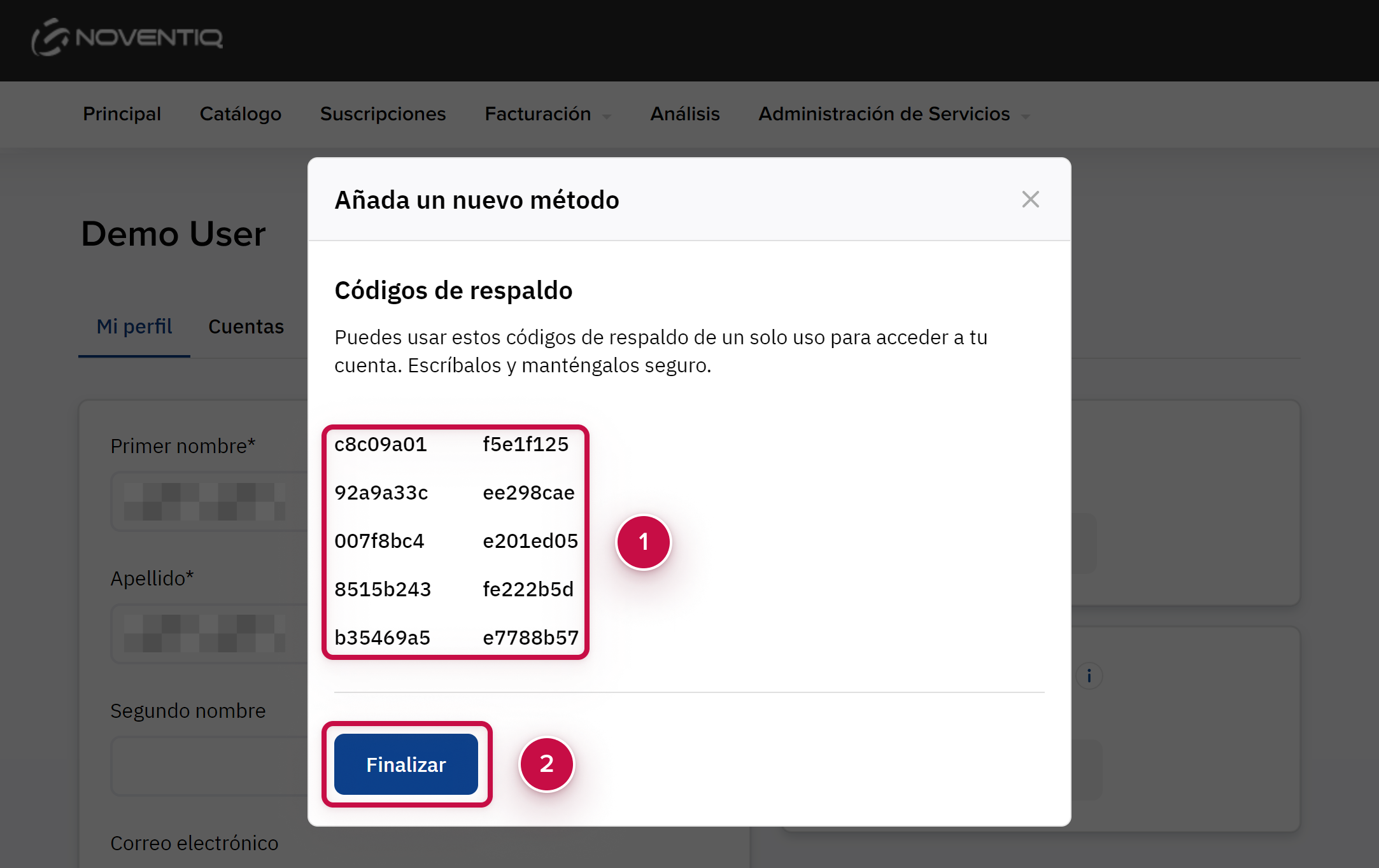 Guarde los códigos mostrados en un lugar seguro. Puede usarlos en lugar de la aplicación de autenticación como opción alternativa al iniciar sesión en el Panel de Control del Cliente. Los códigos de respaldo son para uso único, pero puedes generar otros nuevos.