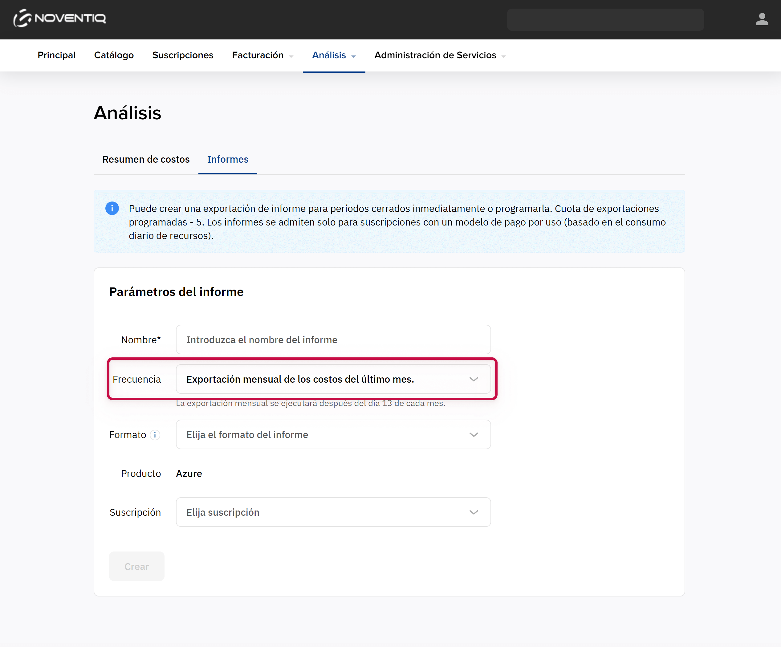 En la lista Frecuencia, seleccione el tipo de informe Exportación mensual de los costos del último mes.