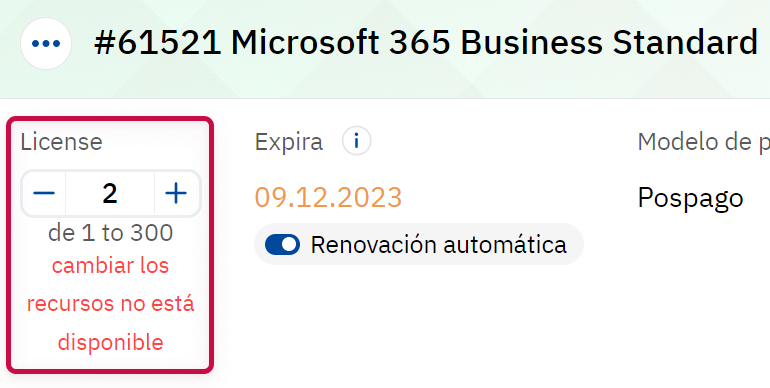 Para las suscripciones con un compromiso, una reducción en la cantidad de recursos puede estar disponible solo por un período limitado después de la compra o renovación. Durante el proceso de pedido, la plataforma verifica la capacidad de reducir la cantidad de recursos por parte del proveedor. Si la reducción no está disponible, verá el mensaje el cambio de recursos no está disponible: