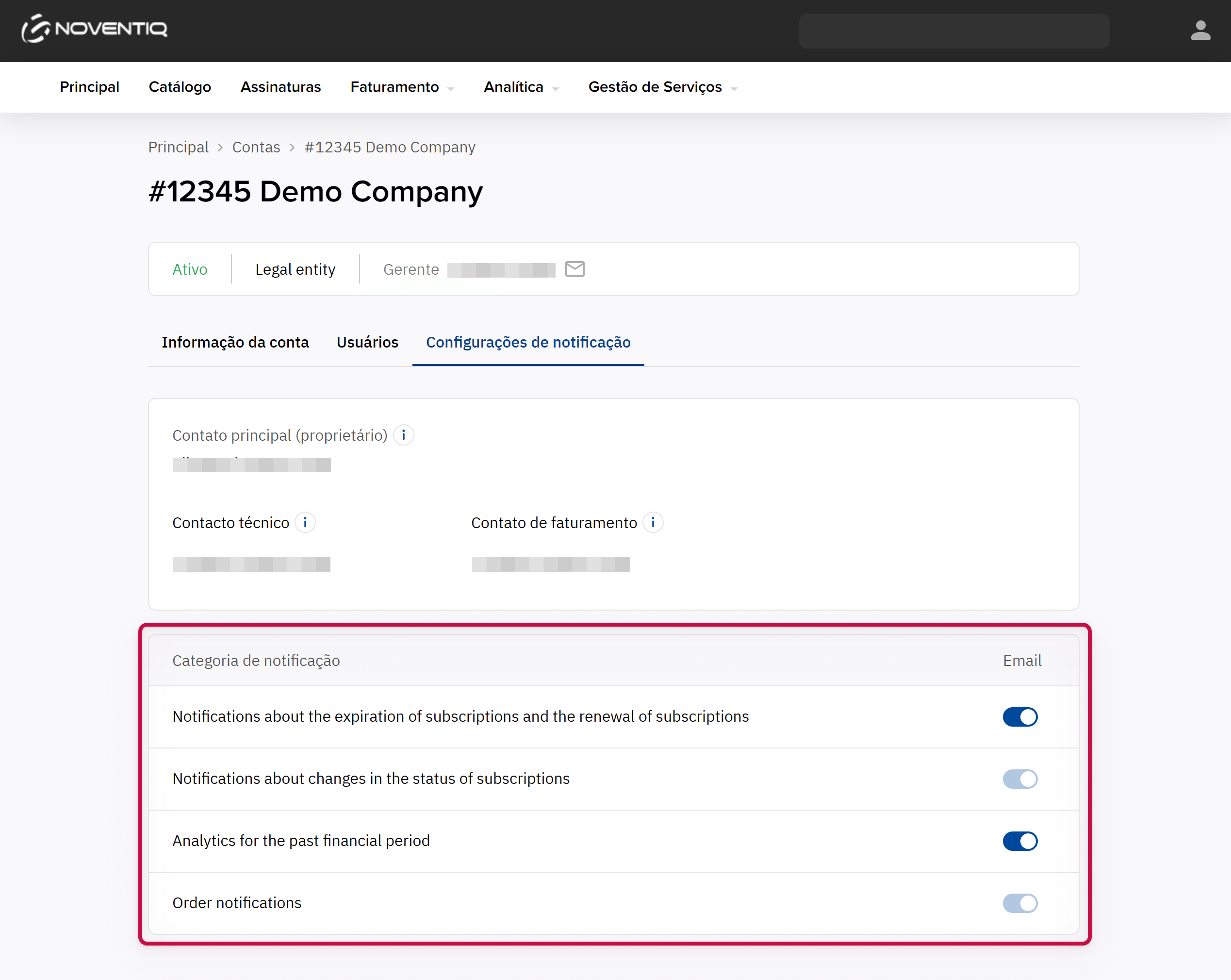As notificações no Painel de controle do Cliente são agrupadas por categorias para sua conveniência. Como proprietário ou administrador de uma conta, você pode selecionar as categorias que pretende receber. Estas definições aplicam-se a todos os usuários da conta: