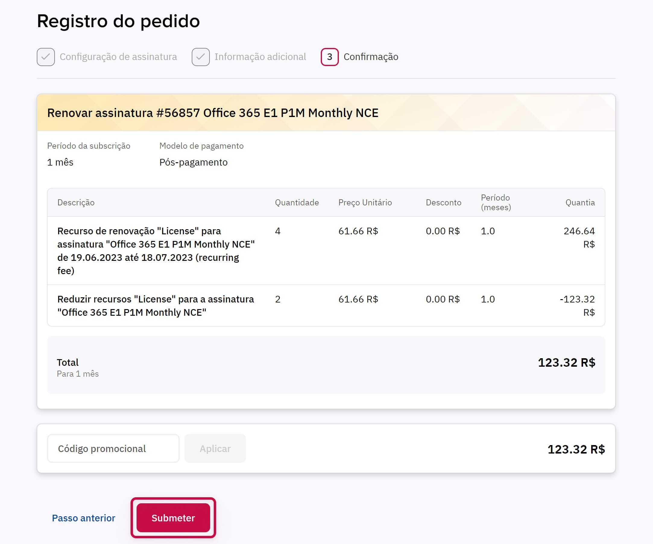 A plataforma criará um pedido de renovação no status Aguardando provisionamento. Na data de expiração, o pedido será concluído e a assinatura será renovada. Até esse momento, você pode modificar o pedido ou selecionar uma opção de renovação diferente.