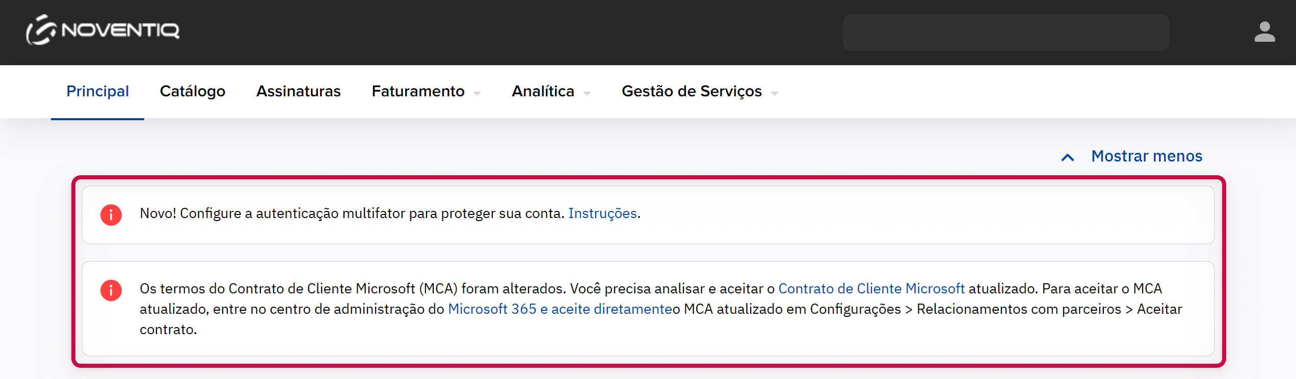 Você recebe dois tipos de notificações: anúncios da Noventiq e alertas por e-mail.