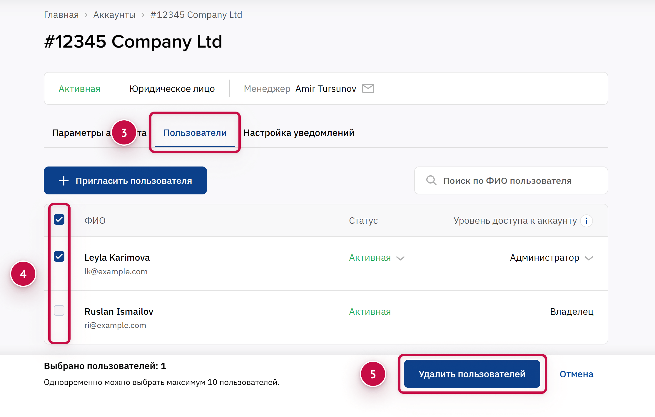 Установите флажки ➃ для пользователей, которых нужно удалить. Внизу страницы появится строка с числом выбранных пользователей и кнопками. Чтобы выбрать всех пользователей на странице, установите флажок в заголовке таблицы. Исключение: нельзя выбрать самого себя и Владельца аккаунта.