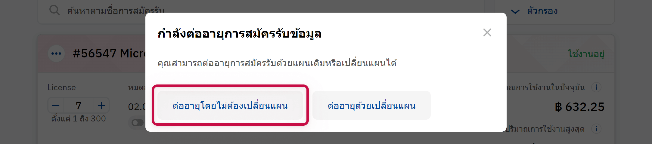 หากต้องการต่ออายุโดยเปลี่ยนจำนวนสิทธิ์ใช้งาน: