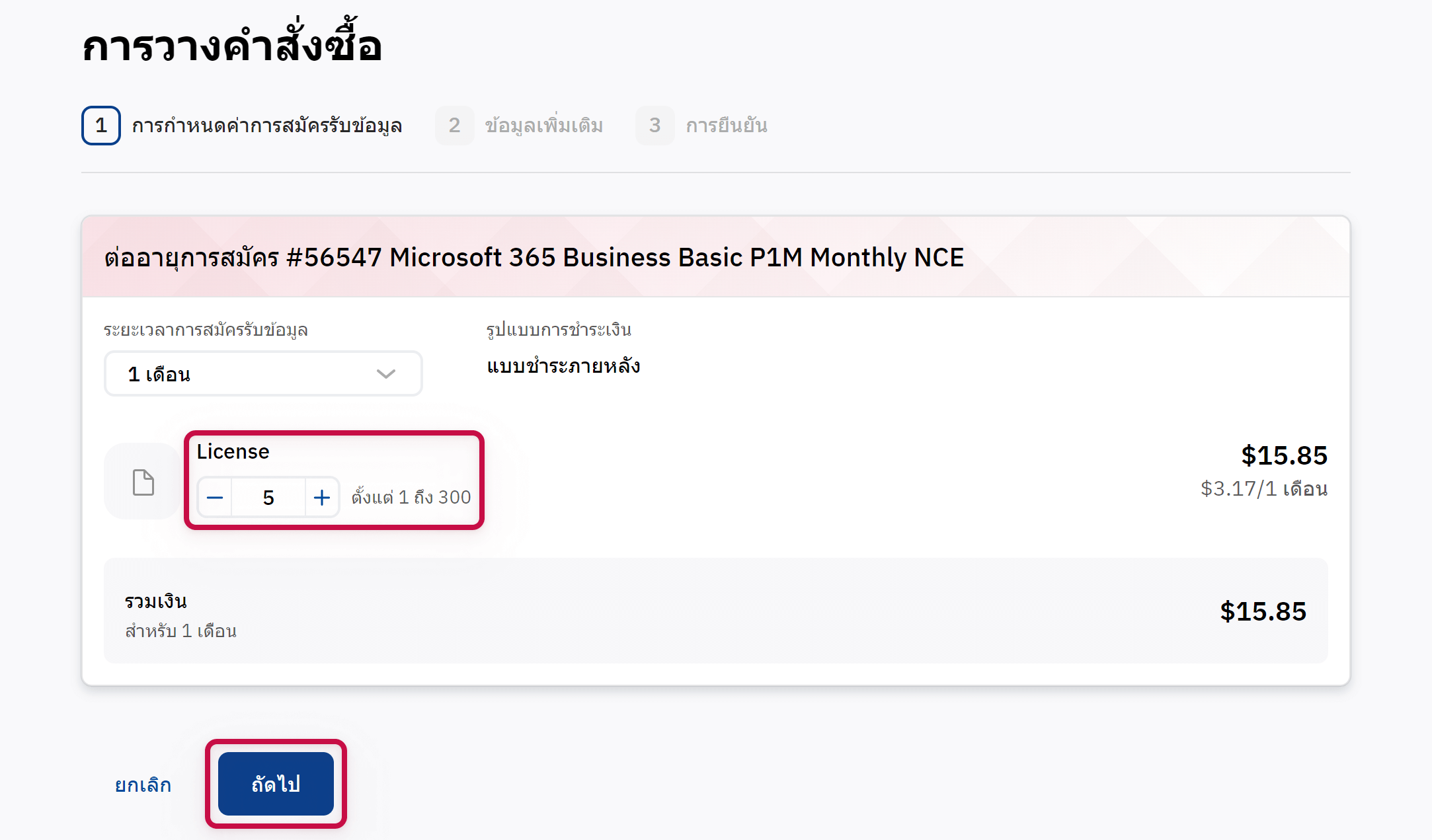 คลิกถัดไปและยืนยันคำสั่งซื้อของคุณ