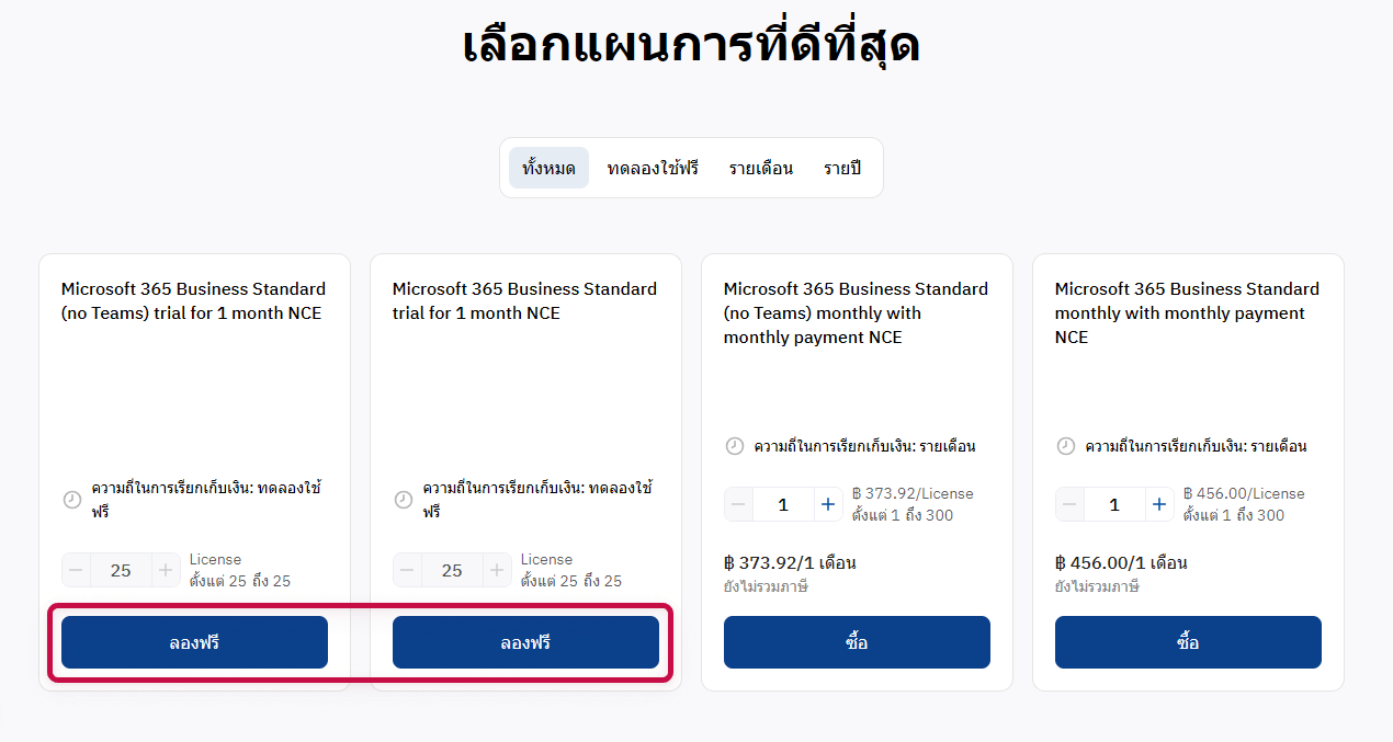 บนหน้าผลิตภัณฑ์ ให้เลือกแผนทดลองใช้งาน และคลิกลองฟรีเพื่อเริ่มขั้นตอนการสั่งซื้อ