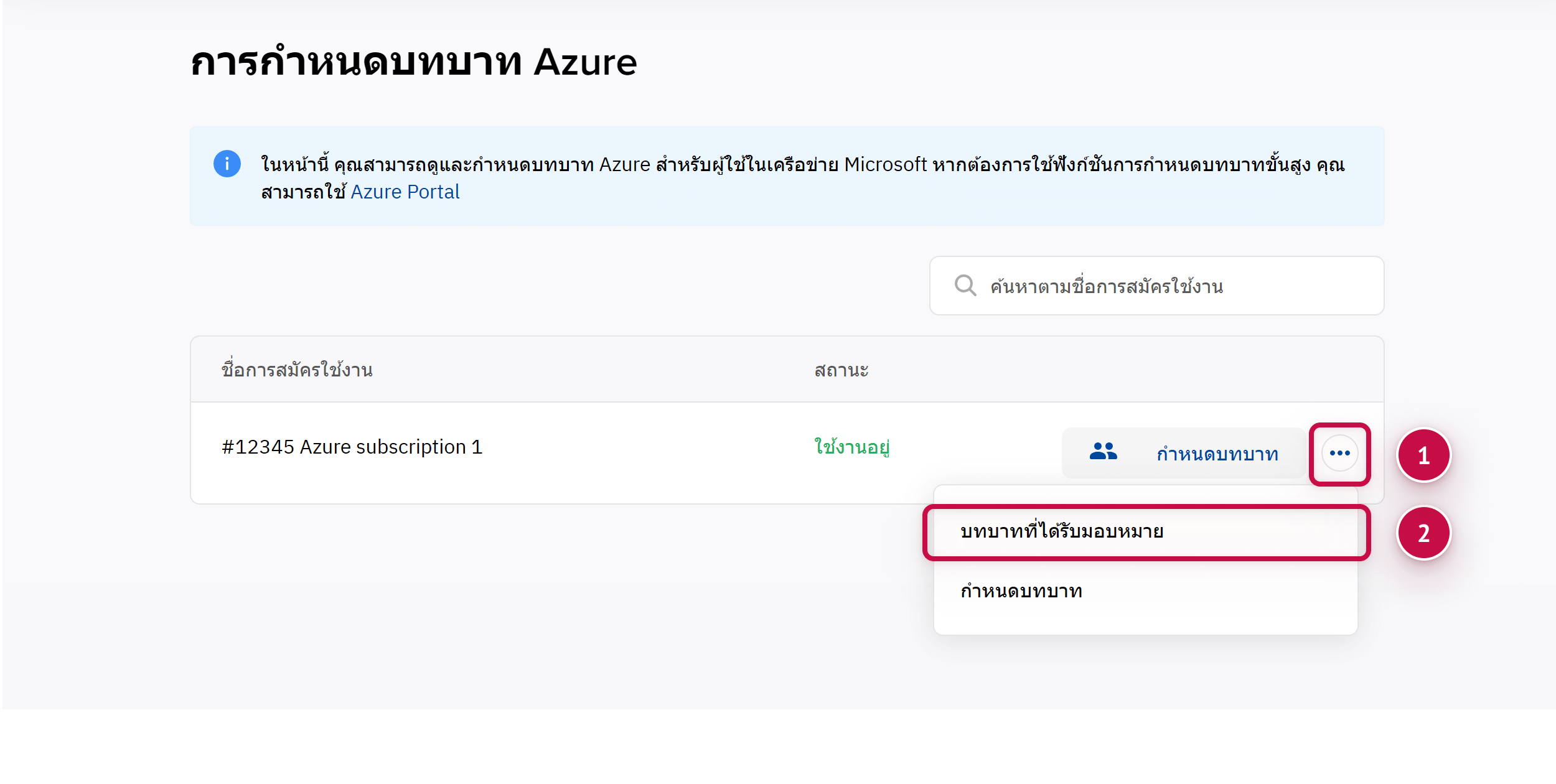 แผงควบคุมไคลเอนต์อนุญาตให้คุณจัดการเฉพาะบทบาทหลัก Owner, Contributor และ Reader หากต้องการใช้ความสามารถในบทบาทขั้นสูง ให้ไปที่พอร์ทัล Azure