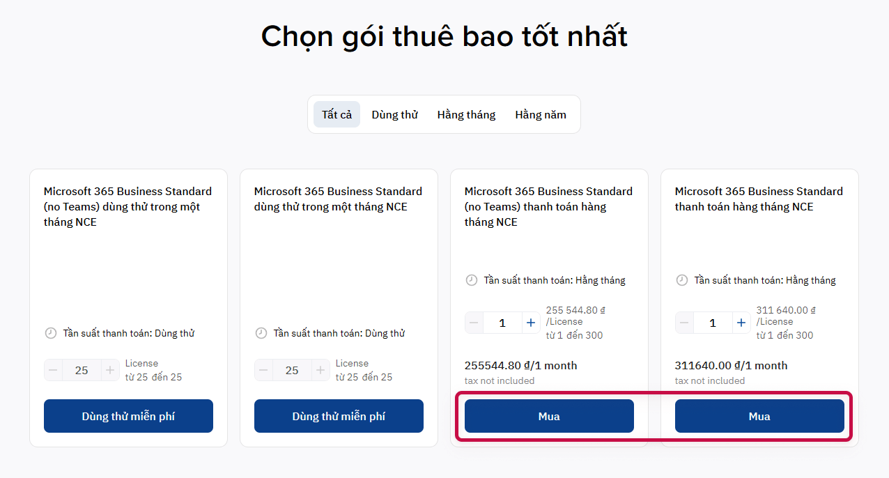 Trên trang sản phẩm, chọn gói thương mại và nhấn Mua để bắt đầu đặt hàng.