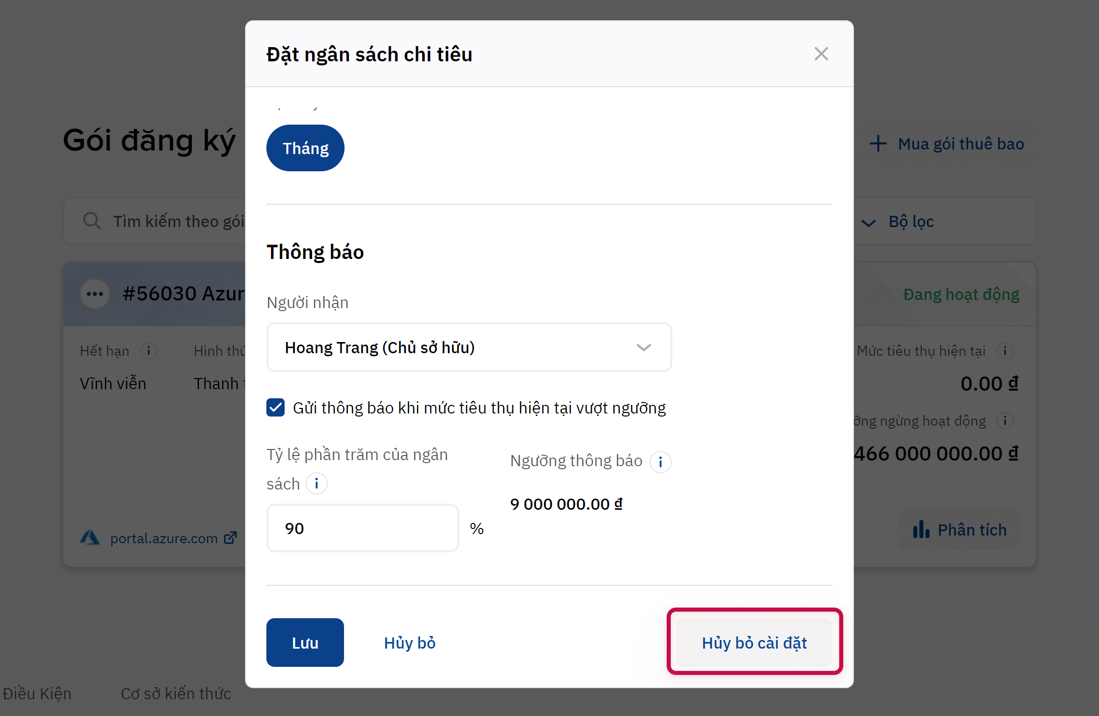 Trong mục Thông báo, cấu hình gửi thông báo về mức tiêu thụ theo ngân sách của đăng ký: